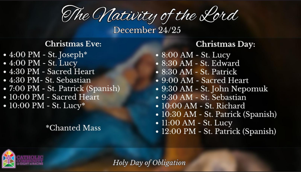 In the Family of Eight Parishes, Masses will be celebrated as follows: